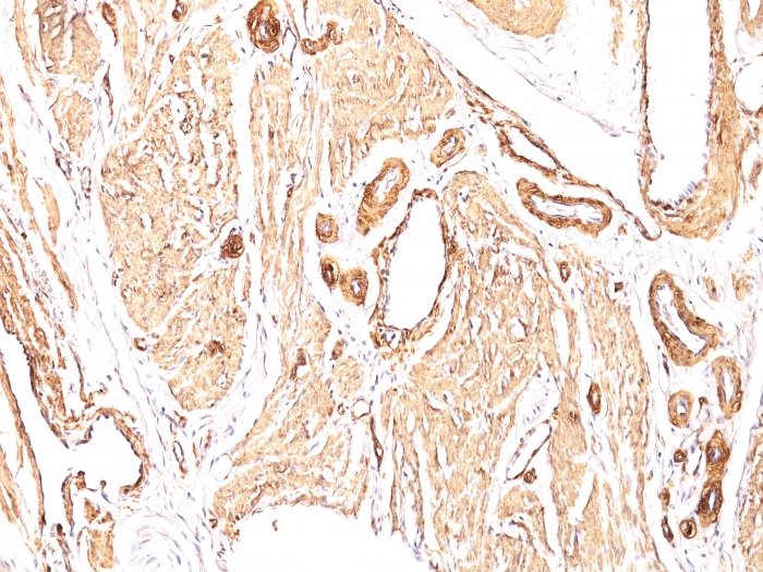 Actin is a major component of the cytoskeleton and is present in most cell types. This MAb is highly specific to actin from smooth muscles. Its epitope lies in the first four N-terminal amino acids. This MAb does not stain cardiac or skeletal muscle; however, it does stain myofibroblasts and myoepithelial cells. This antibody could be used together with anti-muscle specific actin and myogenin in making a diagnosis of smooth muscle and skeletal muscle tumors. In most cases of rhabdomyosarcoma, this antibody yields negative results whereas anti-muscle specific actin and myogenin are positive. Leiomyosarcomas are positive only with anti-muscle specific actin and anti-smooth muscle actin and are negative with anti-myogenin.