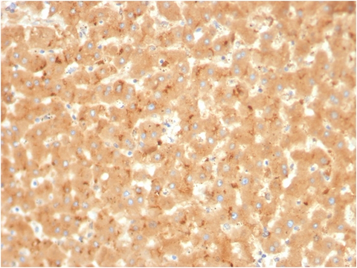 Formalin-fixed, paraffin-embedded human liver stained with Alpha-2-Macroglobulin Mouse Monoclonal Antibody (A2M/3623).