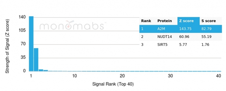 Analysis of Protein Array containing more than 19,000 full-length human proteins using Alpha-2-Macroglobulin Mouse Monoclonal Antibody (A2M/3623). Z- and S- Score: The Z-score represents the strength of a signal that a monoclonal antibody (MAb) (in combination with a fluorescently-tagged anti-IgG secondary antibody) produces when binding to a particular protein on the HuProtTM array. Z-scores are described in units of standard deviations (SD's) above the mean value of all signals generated on that array. If targets on HuProtTM are arranged in descending order of the Z-score, the S-score is the difference (also in units of SD's) between the Z-score. S-score therefore represents the relative target specificity of a MAb to its intended target. A MAb is considered to specific to its intended target, if the MAb has an S-score of at least 2.5. For example, if a MAb binds to protein X with a Z-score of 43 and to protein Y with a Z-score of 14, then the S-score for the binding of that MAb to protein X is equal to 29.