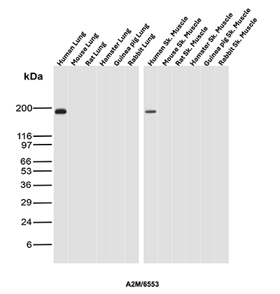 α-2-Macroglobulin (α-2M) is a homotetrameric serum protein consisting of four identical subunits that form dimers through disulfide bonds. Initially, α-2M was characterized as a pan-proteinase inhibitor that was able to bait proteinases into cleaving specific peptide sequences on α-2M. This interaction induces a conformational change in α-2M, thus enabling it to trap the proteinase and further inhibit its activity. Subsequently, α-2M has been shown to function as a carrier protein and regulator of cytokines during inflammation. Circulating transforming growth factor β (TGFβ) in serum is primarily bound to α-2M, which renders TGFβ inactive. α-2M also binds to IL-6 and, thereby, increases the concentration of IL-6 near lymphocytes, hepatocytes and stem cells involved in mediating the inflammatory cascade. Mutations and deletions in the gene encoding α-2M are associated with an increased incidence of Alzheimer s disease (AD), which is consistent with the role of α-2M in mediating the clearance and degradation of A β, the major component of β-Amyloid deposits accumulated during AD.
