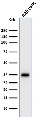 Analysis of Protein Array containing more than 19,000 full-length human proteins using BOB1 Mouse Monoclonal Antibody (BOB1/2422). Z- and S- Score: The Z-score represents the strength of a signal that a monoclonal antibody (MAb) (in combination with a fluorescently-tagged anti-IgG secondary antibody) produces when binding to a particular protein on the HuProtTM array. Z-scores are described in units of standard deviations (SD's) above the mean value of all signals generated on that array. If targets on HuProtTM are arranged in descending order of the Z-score, the S-score is the difference (also in units of SD's) between the Z-score. S-score therefore represents the relative target specificity of a MAb to its intended target. A MAb is considered to specific to its intended target, if the MAb has an S-score of at least 2.5. For example, if a MAb binds to protein X with a Z-score of 43 and to protein Y with a Z-score of 14, then the S-score for the binding of that MAb to protein X is equal to 29.