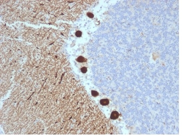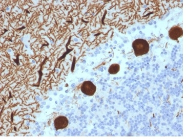 Formalin-fixed, paraffin-embedded human cerebellum stained with Carbonic Anhydrase VIII Mouse Monoclonal Antibody (CPTC-CA8-2). HIER: Tris/EDTA, pH9.0, 45min. 2°: HRP-polymer, 30min. DAB, 5min.