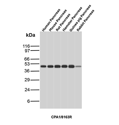 Human pancreatic procarboxypeptidase A exists as three different active forms, two of which are designated carboxypeptidase A1 (CPA1) and carboxypeptidase A2 (CPA2). CPA1, also known as CPA, is a 419 amino acid secreted monomeric protein that is highly expressed in pancreatic tissue. Functioning as a pancreatic exopeptidase, CPA1 uses zinc as a cofactor to catalyze the release of C-terminal amino acids from a variety of proteins, thereby playing a key role in protein digestion and degradation. Via its catalytic activity, CPA1 is also thought to be involved in zymogen (proenzyme) inhibition, probably functioning to block enzyme activation pathways. Abnormal levels of CPA1 are associated with pancreatic cancer, suggesting a possible role in either tumor progression or tumor suppression events.