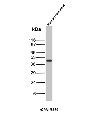 Human pancreatic procarboxypeptidase A exists as three different active forms, two of which are designated carboxypeptidase A1 (CPA1) and carboxypeptidase A2 (CPA2). CPA1, also known as CPA, is a 419 amino acid secreted monomeric protein that is highly expressed in pancreatic tissue. Functioning as a pancreatic exopeptidase, CPA1 uses zinc as a cofactor to catalyze the release of C-terminal amino acids from a variety of proteins, thereby playing a key role in protein digestion and degradation. Via its catalytic activity, CPA1 is also thought to be involved in zymogen (proenzyme) inhibition, probably functioning to block enzyme activation pathways. Abnormal levels of CPA1 are associated with pancreatic cancer, suggesting a possible role in either tumor progression or tumor suppression events.