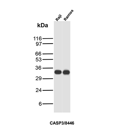This MAb recognizes a protein of 32kDa, identified as Caspase 3. It is an aspartate-specific cysteine protease that belongs to the ICE subfamily of caspases. Caspase-3 is expressed in cells as an inactive precursor from which the p17 and p11 subunits of the mature caspase-3 are proteolytically generated during apoptosis. The caspase-3 precursor is first cleaved at Asp 175-Ser 176 to produce the p11 subunit and the p20 peptide. Subsequently, the p20 peptide is cleaved at Asp 28-Ser 29 to generate the mature p17 subunit. The active caspase-3 enzyme is a heterodimer composed of two p17 and two p11 sub- units. At the onset of apoptosis, caspase-3 proteolytically cleaves PARP at a Asp 216-Gly 217 bond. During the execution of the apoptotic cascade, activated caspase-3 releases SREBP from the membrane of the ER in a proteolytic reaction that is distinct from their normal sterol-dependent activation. Caspase-3 cleaves and activates SREBPs between the basic helix-loop-helix leucine zipper domain and the membrane attachment domain. Caspase-3 also cleaves and activates caspase-6, -7 and -9.