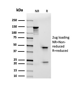This MAb recognizes a protein of 150kDa, identified as CD103, which is the alpha-E integrin subunit of the heterodimeric alpha-E beta-7 (aEb7) integrin belonging to a small beta-7 integrin subfamily. CD103 is expressed on more than 95% of intraepithelial CD8+ cells and on 40% of mucosa-associated T cells, whereas less than 2% of resting blood lymphocytes are CD103-positive. In several malignant conditions, such as T-cell lymphomas and hairy cell leukemia (HCL), the cells express CD103. Antibody to CD103 is an extremely useful addition to the IHC panel for the diagnosis of hairy cell leukemia (HCL).