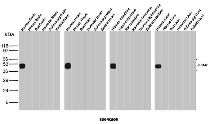 Western blot analysis of Human Brain, Mouse Brain, Rat Brain, Hamster Brain, Guinea pig Brain, Rabbit Brain, Human Heart, Mouse Heart, Rat Heart, Hamster Heart, Guinea pig Heart, Rabbit Heart, Human Intestine, Mouse Intestine, Rat Intestine, Hamster Intestine, Guinea pig Intestine, Rabbit Intestine, Human Liver, Mouse Liver, Rat Liver, Hamster Liver, Guinea pig Liver and Rabbit Liver tissue lysates using CD147 Recombinant Rabbit Monoclonal Antibody (BSG/9290R).