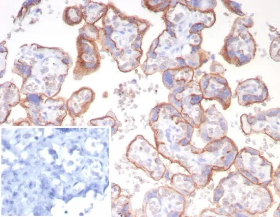 Formalin-fixed, paraffin-embedded human placenta stained with CD147 Mouse Monoclonal Antibody (BSG/7950) at 2ug/ml. Inset: PBS instead of primary antibody; secondary only negative control.