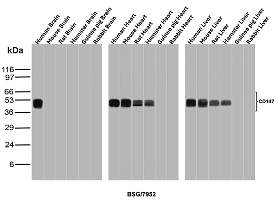 Western blot analysis of Human Brain, Mouse Brain, Rat Brain, Hamster Brain, Guinea pig Brain, Rabbit Brain, Human Heart, Mouse Heart, Rat Heart, Hamster Heart, Guinea pig Heart, Rabbit Heart, Human Liver, Mouse Liver, Rat Liver, Hamster Liver, Guinea pig Liver, and Rabbit Liver tissue lysates using CD147 Mouse Monoclonal Antibody (BSG/7952).