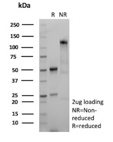 At least five CD1 genes (CD1a, b, c, d, and e) are identified. CD1 proteins have been demonstrated to restrict T cell response to non-peptide lipid and glycolipid antigens and play a role in non-classical antigen presentation. CD1a is a non-polymorphic MHC Class 1 related cell surface glycoprotein, expressed in association with Beta-2 microglobulin. Anti-CD1a labels Langerhans cell histiocytosis (Histiocytosis X), extranodal histiocytic sarcoma, a subset of T-lymphoblastic lymphoma/leukemia, and interdigitating dendritic cell sarcoma of the lymph node. When combined with antibodies against TTF-1 and CD5, anti-CD1a is useful in distinguishing between pulmonary and thymic neoplasms since CD1a is consistently expressed in thymic lymphocytes in both typical and atypical thymomas, but only focally in 1/6 of thymic carcinomas and not in lymphocytes in pulmonary neoplasms. Anti-CD1a is reported to be a new marker for perivascular epithelial cell tumor (PEComa).