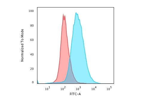 Immunofluorescent staining of Jurkat cells using CD28 Mouse Monoclonal Antibody (204.12) followed by goat anti-Mouse IgG conjugated to CF488 (green). Red Dot is used to labelnuclei (red).