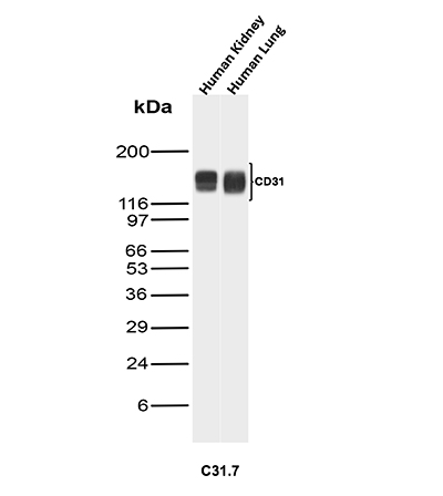CD31 (PECAM-1) is a transmembrane glycoprotein member of the immunoglobulin supergene family of adhesion molecules. CD31 is expressed by stem cells of the hematopoietic system and is primarily used to identify and concentrate these cells for experimental studies as well as for bone marrow transplantation. Anti-CD31 has shown to be highly specific and sensitive for vascular endothelial cells. Staining of nonvascular tumors (excluding hematopoietic neoplasms) is rare. CD31 MAb reacts with normal, benign, and malignant endothelial cells which make up blood vessel lining. The level of CD31 expression can help to determine the degree of tumor angiogenesis, and a high level of CD31 expression may imply a rapidly growing tumor and potentially a predictor of tumor recurrence.