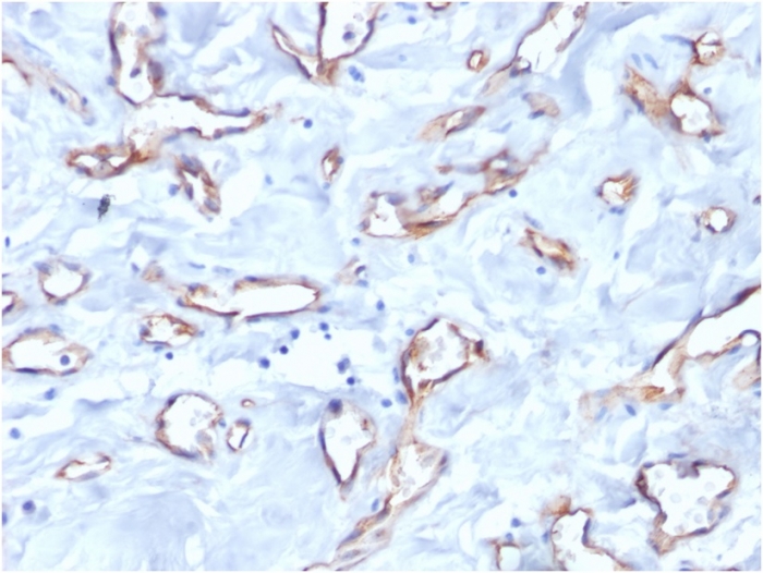 Formalin-fixed, paraffin-embedded human tonsil stained with CD34 Mouse Monoclonal Antibody (QBEnd/10).