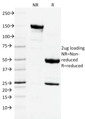 SDS-PAGE Analysis of Purified CD3e Mouse Monoclonal Antibody (C3e/2478). Confirmation of Purity and Integrity of Antibody.