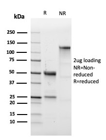 It recognizes a cell surface glycoprotein of 95/115/135kDa (depending upon the extent of glycosylation), identified as CD43. 70-90% of T-cell lymphomas and from 22-37% of B-cell lymphomas express CD43. No reactivity has been observed with reactive B-cells. So a B-lineage population that co-expresses CD43 is highly likely to be a malignant lymphoma, especially a low-grade lymphoma, rather than a reactive B-cell population. When CD43 antibody is used in combination with anti-CD20, effective immunophenotyping of the lymphomas in formalin-fixed tissues can be obtained. Co-staining of a lymphoid infiltrate with anti-CD20 and anti-CD43 argues against a reactive process and favors a diagnosis of lymphoma.