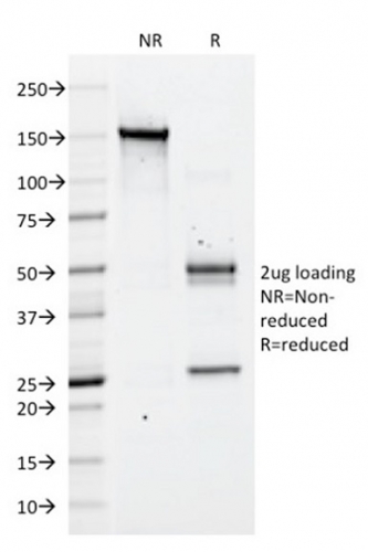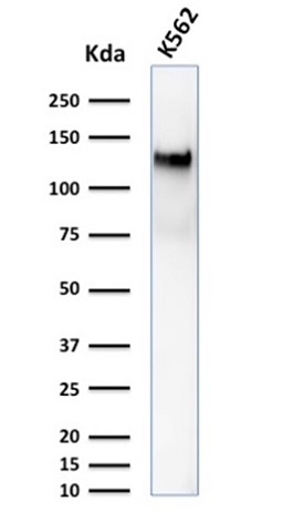 It recognizes a cell surface glycoprotein of 95/115/135kDa (depending upon the extent of glycosylation), identified as CD43 [Workshop IV]. Epitope of MAb Bra7G is clearly different from that of MAb DF-T1, called b as opposed to a for DF-T1. 70-90% of T-cell lymphomas and from 22-37% of B-cell lymphomas express CD43. No reactivity has been observed with reactive B-cells. So a B-lineage population that co-expresses CD43 is highly likely to be a malignant lymphoma, especially a low-grade lymphoma, rather than a reactive B-cell population. When CD43 antibody is used in combination with anti-CD20, effective immunophenotyping of the lymphomas in formalin-fixed tissues can be obtained. Co-staining of a lymphoid infiltrate with anti-CD20 and anti-CD43 argues against a reactive process and favors a diagnosis of lymphoma.