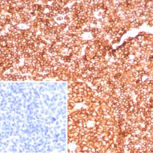 CD45R, also designated CD45 and PTPRC, has been identified as a transmembrane glycoprotein, broadly expressed among hematopoietic cells. Multiple isoforms of CD45R are distributed throughout the immune system according to cell type. These isoforms arise because of alternative splicing of exons 4, 5, and 6. The corresponding protein domains are characterized by the binding of monoclonal antibodies specific for CD45RA (exon 4), CD45RB (exon 5), CD45RC (exon 6) and CD45RO (exons 4 to 6 spliced out). The variation in these isoforms is localized to the extracellular domain of CD45R, while the intracellular domain is conserved. CD45R functions as a phosphor-tyrosine phosphatase. Antibody to CD45 is useful in differential diagnosis of lymphoid tumors from non-hematopoietic undifferentiated neoplasms.