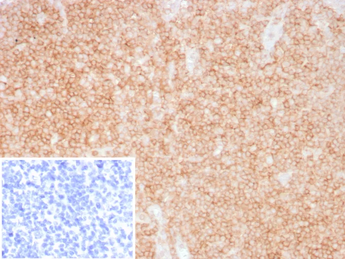 Formalin-fixed, paraffin-embedded human tonsil stained with CD48 Recombinant Rabbit Monoclonal Antibody (CD48/8360R). Inset: PBS instead of primary antibody; secondary only negative control.