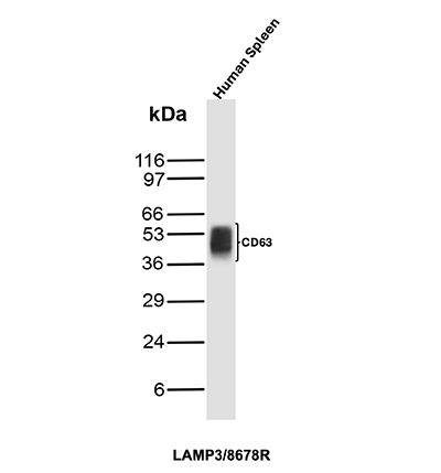 This MAb recognizes protein of 26kDa-60kDa, which is identified as CD63. Its epitope is different from that of MAb LAMP3/529. The tetraspanins are integral membrane proteins expressed on cell surface and granular membranes of hematopoietic cells and are components of multi-molecular complexes with specific integrins. The tetraspanin CD63 is a lysosomal membrane glycoprotein that translocates to the plasma membrane after platelet activation. CD63 is expressed on activated platelets, monocytes and macrophages, and is weakly expressed on granulocytes, T cell and B cells. It is located on the basophilic granule membranes and on the plasma membranes of lymphocytes and granulocytes. CD63 is a member of the TM4 superfamily of leukocyte glycoproteins that includes CD9, CD37 and CD53, which contain four transmembrane regions. CD63 may play a role in phagocytic and intracellular lysosome-phagosome fusion events. CD63 deficiency is associated with Hermansky-Pudlak syndrome and is strongly expressed during the early stages of melanoma progression.