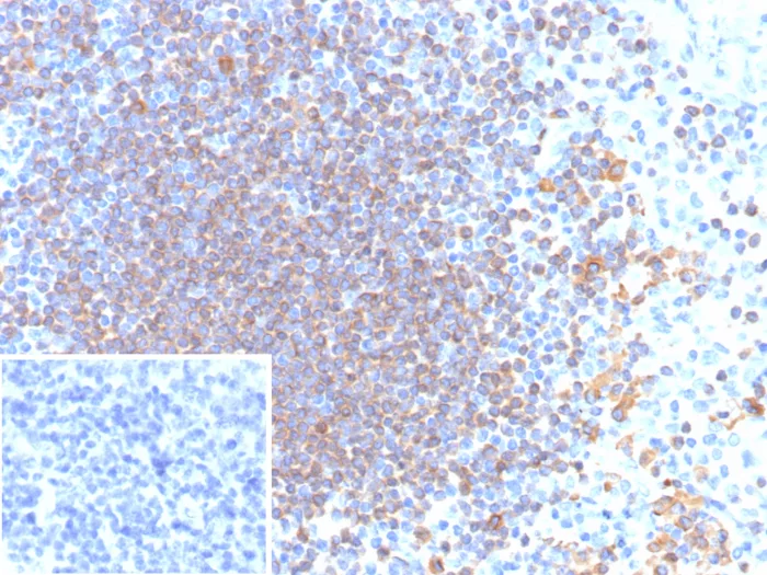 A disulphide-linked heterodimer, consisting of mb-1 (or CD79a) and B29 (or CD79b) polypeptides, is non-covalently associated with membrane-bound immunoglobulins on B cells. This complex of mb-1 and B29 polypeptides and immunoglobulin constitute the B cell Ag receptor. CD79a first appears at pre B cell stage, early in maturation, and persists until the plasma cell stage where it is found as an intracellular component. CD79a is found in the majority of acute leukemias of precursor B cell type, in B cell lines, B cell lymphomas, and in some myelomas. It is not present in myeloid or T cell lines. Anti-CD79a is generally used to complement anti-CD20 especially for mature B-cell lymphomas after treatment with Rituximab (anti-CD20). This antibody will stain many of the same lymphomas as anti-CD20, but also is more likely to stain B-lymphoblastic lymphoma/leukemia than is anti-CD20. Anti-CD79a also stains more cases of plasma cell myeloma and occasionally some types of endothelial cells as well.