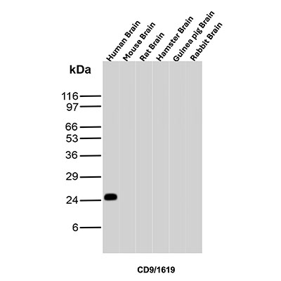 CD9 is a type IV transmembrane glycoprotein with four transmembrane domains. CD9 on pre-B cells may play a role in cell-cell adhesion. In addition, CD9 may play a role in signal transduction mediated by interaction with low molecular weight GTP binding proteins. CD9 is expressed on early B cells, eosinophils, basophils and activated T cells and is a major component of the platelet cell surface. It is also expressed on most non-T acute lymphoblastic leukemia cells and on some acute myeloid and chronic lymphoid leukemia.