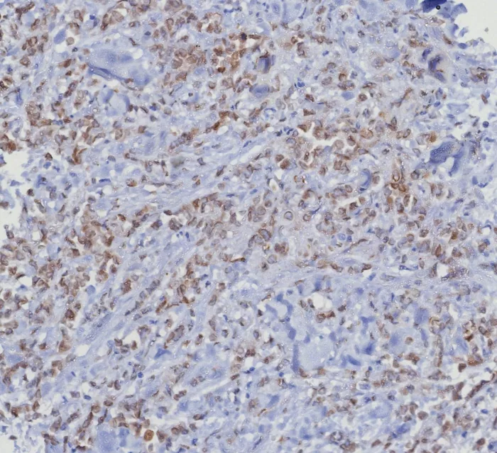 Cyclin-dependent kinase-4 (CDK4) is a protein-serine kinase involved in the cell cycle. It is essential for the G1- to S-phase transition during the cell cycle and its expression is primarily controlled at the transcriptional level (PMID:17253961). CCND1- CDK4 axis is not only critical in glial tumor cells but also in stromal-derived cells in the surrounding tumor microenvironment that are vital to sustain tumor outgrowth (PMID:21844184). CDK4 is highly expressed in highly differentiated and dedifferentiated liposarcomas, but rarely expressed in other benign liposarcomas and other sarcomas. CDK4 and MDM2 combined to differentiate between highly differentiated liposarcoma (+), dedifferentiated liposarcoma (+) and myxoid liposarcoma, pleomorphic liposarcoma, spindle lipoma, pleomorphic lipoma and other high-grade sarcomas.