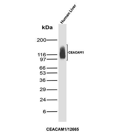 Carcinoembryonic antigen (CEA) is one of the most commonly used tumor markers in serum immunoassay determinations of carcinoma. Members of the CEACAM (carcinoembryonic antigen-related cell adhesion molecule) family contain a single N domain, with structural homology to the immunoglobulin variable domains, followed by a variable number of immunoglobulin constantlike A and/or B domains. CEACAM1 (carcinoembryonic antigen-related cell adhesion molecule 1), also known as BGP or BGP1, is a 526 amino acid protein that exists as seven alternatively spliced isoforms, some of which localize to the cell membranes, while others are secreted. One of several members of the CEACAM family, CEACAM1 contains one Ig-like V-type domain and three Ig-like C2-type domains and is thought to play a role in a variety of cellular activities, including angiogenesis, apoptosis, arrangement of tissue threedimensional structure and modulation of innate and adaptive immune responses. Additionally, CEACAM1 is underexpressed in colorectal cancers, suggesting a role in tumor suppression.