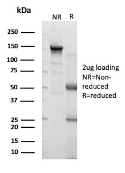 Cytokeratin 14 is a member of the type I keratin family of intermediate filament proteins. It always pairs with the type II keratin K5 and form the primary keratin pair of the keratinocytes of stratified squamous epithelia, including the epidermis as well as mucosal non-keratinizing stratified squamous epithelia. Cytokeratin 14 is strongly expressed in the undifferentiated basal cell layer containing the stem cells and are down-regulated in the differentiating suprabasal cell layers. Otherwise, in the widely well stratified follicular outer root sheath, cytokeratin 14 is uniformly expressed throughout all layers. The expression spectrum of cytokeratin 14 in tumors corresponds well to the patterns in normal epithelia. Thus, most squamous cell carcinomas as well as malignant mesotheliomas strongly express this keratin whereas little, focal, or no expression is found in adenocarcinomas. Cytokeratin 14 may be a useful marker in the differential diagnosis of squamous cell carcinoma from other epithelial tumors. Recent studies also indicate that CK14 expression in breast cancer corresponded with poor clinical outcome and that CK14 may have diagnostic value in the sub-classification of NSCLC.