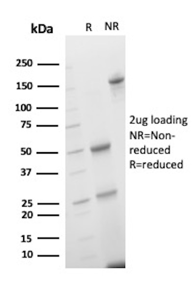 Cytokeratin 14 is a member of the type I keratin family of intermediate filament proteins. It always pairs with the type II keratin K5 and form the primary keratin pair of the keratinocytes of stratified squamous epithelia, including the epidermis as well as mucosal non-keratinizing stratified squamous epithelia.Cytokeratin 14 is strongly expressed in the undifferentiated basal cell layer containing the stem cells and are down-regulated in the differentiating suprabasal cell layers. Otherwise, in the widely well stratified follicular outer root sheath, cytokeratin 14 is uniformly expressed throughout all layers. The expression spectrum of cytokeratin 14 in tumors corresponds well to the patterns in normal epithelia. Thus, most squamous cell carcinomas as well as malignant mesotheliomas strongly express this keratin whereas little, focal, or no expression is found in adenocarcinomas.Cytokeratin 14 may be a useful marker in the differential diagnosis of squamous cell carcinoma from other epithelial tumors. Recent studies also indicate that CK14 expression in breast cancer corresponded with poor clinical outcome and that CK14 may have diagnostic value in the sub-classification of NSCLC.