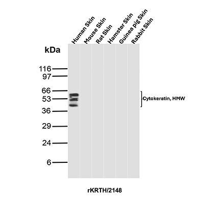 This antibody recognizes CK1, CK5, CK10 and CK14. In normal epithelia, it stains stratified epithelia, myoepithelial cells and basal cells in the prostate gland and bronchi. This MAb shows no reactivity with hepatocytes, pancreatic acinar cells, proximal renal tubules, or endometrial glands; there is no reactivity with cells derived from simple epithelia. Mesenchymal tumors, lymphomas, melanomas, neural tumors, and neuroendocrine tumors are negative with this antibody. It stains myoepithelial cells and has been shown to be useful in distinguishing prostate adenocarcinoma from benign prostate. This antibody has also been useful in separating benign from malignant intraductal breast proliferations.
