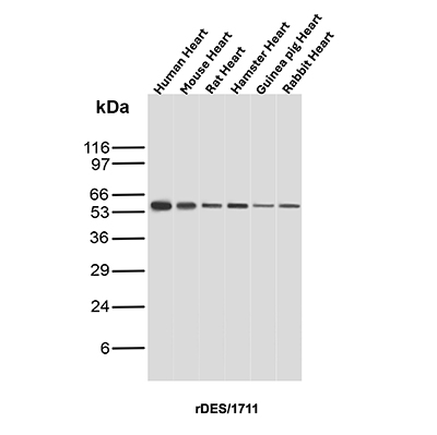 Cytoskeletal intermediate filaments (IFs) constitute a diverse group of proteins that are expressed in a highly tissue-specific manner. IFs are constructed from two-chain 伪-helical coiled-coil molecules arranged on an imperfect helical lattice, and have been widely used as markers for distinguishing individual cell types within a tissue and identifying the origins of metastatic tumors. Vimentin is an IF general marker of cells originating in the mesenchyme. Vimentin and Desmin, a related class III IF, are both expressed during skeletal muscle development. Desmin, a 469 amino acid protein found near the Z line in sarcomeres, is expressed more frequently in adult differentiated state tissues. Anti-desmin detects cells of normal smooth, skeletal, and cardiac muscles.Antibody reacts with leiomyomas, leiomyosarcoma, rhabdomyomas, rhabdomyosarcoma, and perivascular cells of glomus tumors of the skin.