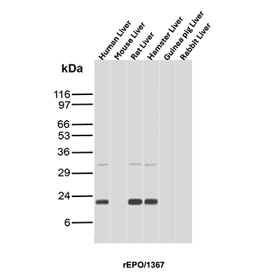 Recognizes a protein of about 37kDa, which is identified as Erythropoietin (EPO). Erythropoietin is a secreted, glycosylated cytokine hormone composed of four alpha helical bundles. It is the primary factor responsible for regulating erythropoiesis during steady-state conditions and in response to blood loss and hemorrhage in the adult organism. Erythropoietin is synthesized by the kidney and stimulates the proliferation and maturation of bone marrow erythroid precursor cells. The protein is found in the plasma and regulates red cell production by promoting erythroid differentiation and initiating hemoglobin synthesis.