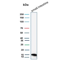 Formalin-fixed, paraffin-embedded human small intestine stained with FABP2 Mouse Monoclonal Antibody (FABP2/7670). HIER: Tris/EDTA, pH9.0, 45min. 2: HRP-polymer, 30min. DAB, 5min.