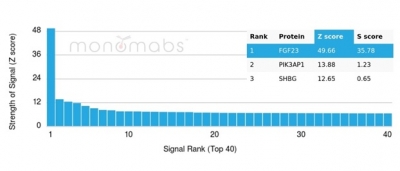 Analysis of Protein Array containing more than 19,000 full-length human proteins using FGF23-Monospecific Mouse Monoclonal Antibody (FGF23/4174). Z- and S- Score: The Z-score represents the strength of a signal that a monoclonal antibody (MAb) (in combination with a fluorescently-tagged anti-IgG secondary antibody) produces when binding to a particular protein on the HuProtTM array. Z-scores are described in units of standard deviations (SD's) above the mean value of all signals generated on that array. If targets on HuProtTM are arranged in descending order of the Z-score, the S-score is the difference (also in units of SD's) between the Z-score. S-score therefore represents the relative target specificity of a MAb to its intended target. A MAb is considered to specific to its intended target, if the MAb has an S-score of at least 2.5. For example, if a MAb binds to protein X with a Z-score of 43 and to protein Y with a Z-score of 14, then the S-score for the binding of that MAb to protein X is equal to 29.