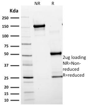 This MAb recognizes a protein of ~50kDa which is identified as Glial Fibrillary Acidic Protein (GFAP). It shows no cross-reaction with other intermediate filament proteins. GFAP is specifically found in astroglia. GFAP is a very popular marker for localizing benign astrocyte and neoplastic cells of glial origin in the central nervous system. Antibody to GFAP is useful in differentiating primary gliomas from metastatic lesions in the brain and for documenting astrocytic differentiation in tumors outside the CNS.