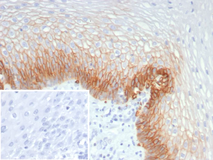 Formalin-fixed, paraffin-embedded human ovarian carcinoma stained with GLUT-1 Mouse Monoclonal Antibody (GLUT1/7308). Inset: PBS instead of primary antibody; secondary only negative control.