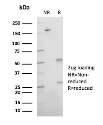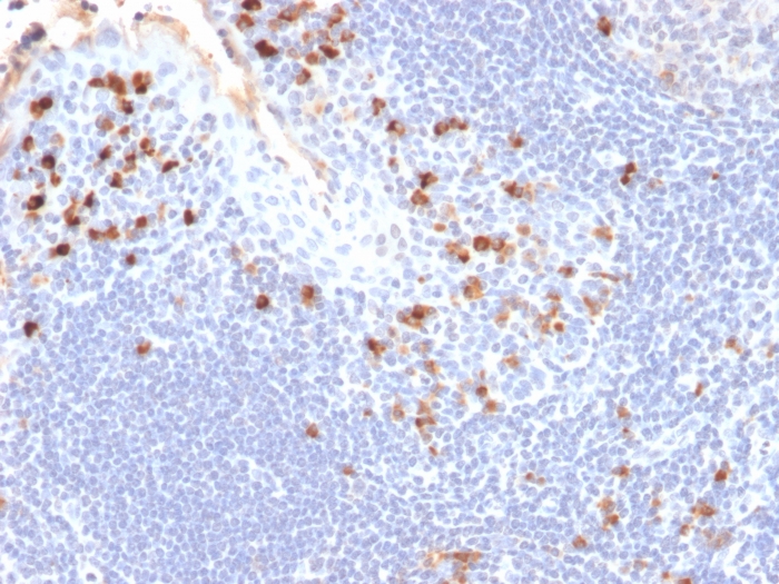 This MAb is specific to kappa light chain of immunoglobulin and shows no cross-reaction with lambda light chain or any of the five heavy chains. In mammals, the two light chains in an antibody are always identical, with only one type of light chain, kappa or lambda. The ratio of Kappa to Lambda is 70:30. However, with the occurrence of multiple myeloma or other B-cell malignancies this ratio is disturbed. Antibody to the kappa light chain is reportedly useful in the identification of leukemias, plasmacytomas, and certain non-Hodgkin’s lymphomas. Demonstration of clonality in lymphoid infiltrates indicates that the infiltrate is malignant.