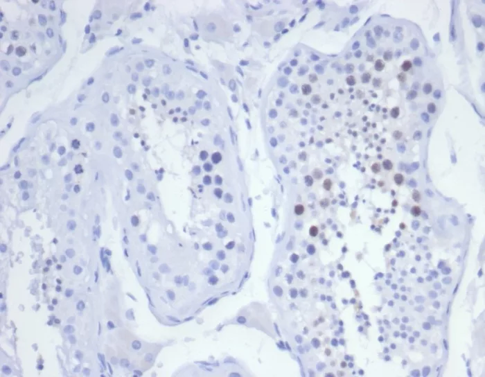 Formalin-fixed, paraffin-embedded human testis stained with KIF2C Mouse Monoclonal Antibody (KIF2C/6525) at 2ug/ml. HIER: Tris/EDTA, pH9.0, 45min. 2°C: HRP-polymer, 30min. DAB, 5min.
