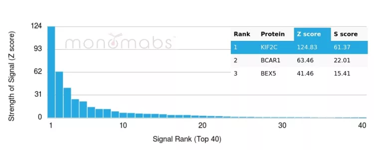 Analysis of Protein Array containing more than 19,000 full-length human proteins using KIF2C / MCAK Mouse Monoclonal Antibody (KIF2C/6525). Z- and S- Score: The Z-score represents the strength of a signal that a monoclonal antibody (MAb) (in combination with a fluorescently-tagged anti-IgG secondary antibody) produces when binding to a particular protein on the HuProtTM array. Z-scores are described in units of standard deviations (SD's) above the mean value of all signals generated on that array. If targets on HuProtTM are arranged in descending order of the Z-score, the S-score is the difference (also in units of SD's) between the Z-score. S-score therefore represents the relative target specificity of a MAb to its intended target. A MAb is considered to specific to its intended target, if the MAb has an S-score of at least 2.5. For example, if a MAb binds to protein X with a Z-score of 43 and to protein Y with a Z-score of 14, then the S-score for the binding of that MAb to protein X is equal to 29.