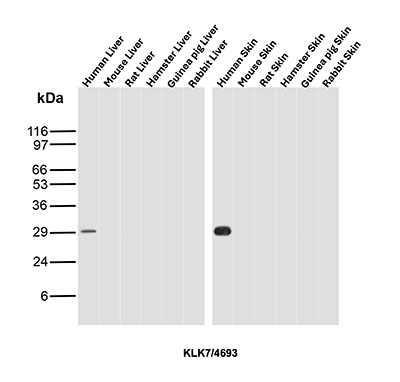 Western Blot Analysis of Human Liver and Human Skin tissue lysates using KLK7 Mouse Monoclonal Antibody (KLK7/4693).
