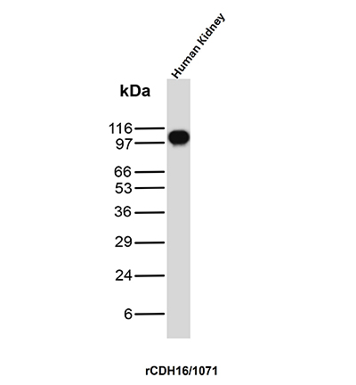 Western Blot Analysis of human kidney tissue lysate using KSP-Cadherin Recombinant Mouse Monoclonal Antibody (rCDH16/1071).