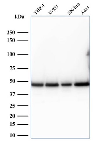Western blot analysis of human THP-1, U937, SK-BR3 and A431 cell lysates. Laminin Receptor Mouse Monoclonal Antibody (RPSA/2699).