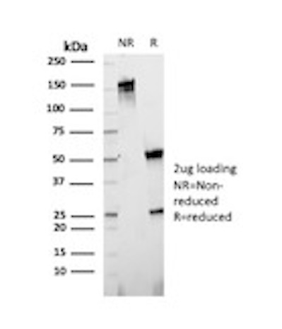 This antibody recognizes a protein doublet of 20-22kDa, identified as MART-1 (Melanoma Antigen Recognized by T cells 1) or Melan-A. MART-1 is a newly identified melanocyte differentiation antigen recognized by autologous cytotoxic T lymphocytes. Seven other melanoma associated antigens recognized by autologous cytotoxic T cells include MAGE-1, MAGE-3, tyrosinase, gp100, gp75, BAGE-1, and GAGE-1. Subcellular fractionation shows that MART-1 is present in melanosomes and endoplasmic reticulum. This MAb labels melanomas and other tumors showing melanocytic differentiation. It is also a useful positive-marker for angiomyolipomas. It does not stain tumor cells of epithelial, lymphoid, glial, or mesenchymal origin.