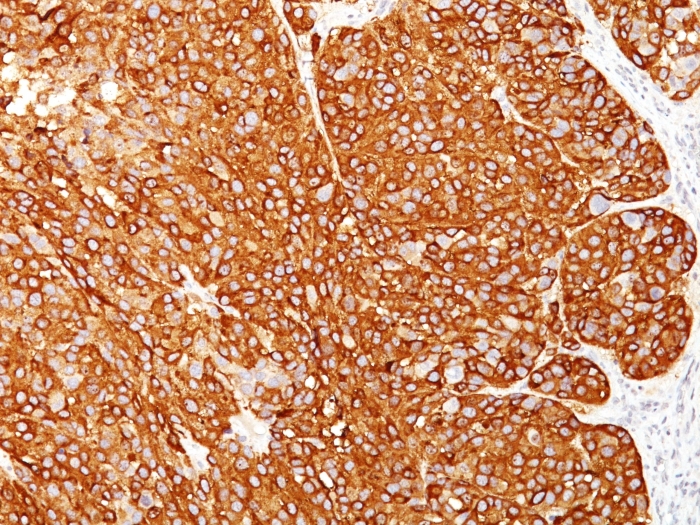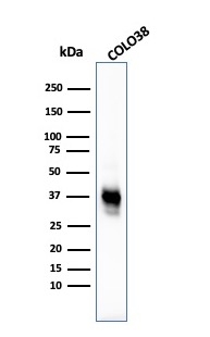 This antibody cocktail recognizes three melanoma-specific proteins, which include MART-1, Tyrosinase and gp100. MART-1 is a newly identified melanocyte differentiation antigen recognized by autologous cytotoxic T lymphocytes. Tyrosinase is one of the targets for cytotoxic T-cell recognition in melanoma patients. Function of gp100 is not known but it is reported to be a useful marker for melanocytes and melanomas. This cocktail of three markers is designed for extremely sensitive labeling of formalin-fixed, paraffin-embedded melanomas and other tumors showing melanocytic differentiation.