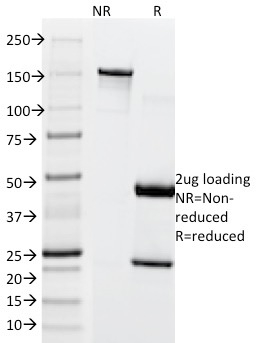 MITF (microphthalmia transcription factor) is a basic helix-loop-helix-leucine-zipper (bHLH-Zip) transcription factor that regulates the development and survival of melanocytes and retinal pigment epithelium, and also is involved in transcription of pigmentation enzyme genes such as tyrosinase TRP1 and TRP2. MITF has been shown to be phosphorylated by MAP kinase in response to c-kit activation, resulting in upregulation of MITF transcriptional activity. Mutations of the MITF gene are associated with the autosomal dominant hereditary deafness and pigmentation condition, Waardenburg Syndrome type 2A. Multiple isoforms of MITF exist, including MITF-A, MITF-B, MITF-C, MITF-H, and MITF-M, which differ in the amino-terminal domain and in their expression patterns. The MITF-M isoform is restricted to the melanocyte cell lineage. Anti-MITF, D5, recognizes a nuclear protein, which is expressed in the majority of primary and metastatic epithelioid malignant melanomas as well as in normal melanocytes, benign nevi and dysplastic nevi.