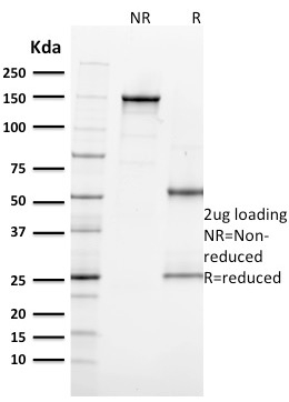 MITF (microphthalmia transcription factor) is a basic helix-loop-helix-leucine-zipper (bHLH-Zip) transcription factor that regulates the development and survival of melanocytes and retinal pigment epithelium, and also is involved in transcription of pigmentation enzyme genes such as tyrosinase TRP1 and TRP2. MITF has been shown to be phosphorylated by MAP kinase in response to c-kit activation, resulting in upregulation of MITF transcriptional activity. Mutations of the MITF gene are associated with the autosomal dominant hereditary deafness and pigmentation condition, Waardenburg Syndrome type 2A. Multiple isoforms of MITF exist, including MITF-A, MITF-B, MITF-C, MITF-H, and MITF-M, which differ in the amino-terminal domain and in their expression patterns. The MITF-M isoform is restricted to the melanocyte cell lineage. This MAb recognizes a nuclear protein, which is expressed in the majority of primary and metastatic epithelioid malignant melanomas as well as in normal melanocytes, benign nevi and dysplastic nevi.