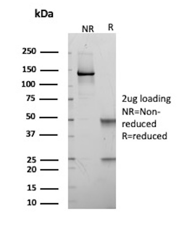 Recognizes a single glycoprotein of 520kDa, identified as mucin 2 (MUC2). This MAb shows no cross-reaction with human milk fat globule membranes, MUC1, or MUC3. Its epitope has been defined as GTQTP (GlyThrGlnThrPro). Mucins are high molecular weight glycoproteins, which constitute the major component of the mucus layer that protects the gastric epithelium. MUC2 is specifically expressed in goblet cells of the small intestine in about 65% of colonic carcinomas and about 40% of gastric carcinomas. MUC2 is rarely expressed outside of the GI tract with the exceptions of mucinous carcinoma of breast and clear cell-type carcinomas of the ovary.