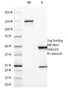 It recognizes a protein of HMW, identified as mucin 3 glycoprotein (MUC3). Its epitope localizes between aa SITTTE. This MAb shows no cross-reaction with human milk fat globule membranes, MUC1, or MUC2. MUC3 is distributed in colon and rectum, and is also present to a lesser extent in breast, lung and salivary gland tissues.The Mucins are a family of highly glycosylated, secreted proteins with a basic structure consisting of a variable number of tandem repeats (VNTRs) encoded by 60 base pairs (Mucin 1), 69 base pairs (Mucin 2) and 51 base pairs (Mucin 3). The number of repeats is highly polymorphic and varies among different alleles. Mucin 1 proteins are expressed as type I membrane proteins in addition to secreted forms. Mucin 1 is aberrantly expressed in epithelial tumors including breast carcinomas. Mucin 2 coats the epithelia of the intestines and airways and is associated with colonic tumors. Mucin 3 is a major component of various mucus gels and is broadly expressed in normal and tumor cells.