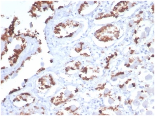 Formalin-fixed, paraffin-embedded human stomach stained with MUC5AC Recombinant Rabbit Monoclonal (MUC5AC/7068R) at 2ug/ml. HIER: Tris/EDTA, pH9.0, 45min. 2°C: HRP-polymer, 30min. DAB, 5min.