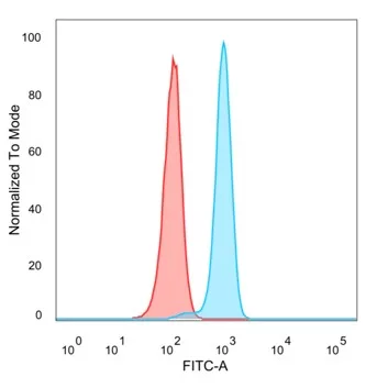 Flow cytometric analysis of PFA-fixed HeLa cells. n-Myc Mouse Monoclonal Antibody (PCRP-MYCN-1A9) followed by goat anti-mouse IgG-CF488 (blue), unstained cells (red).
